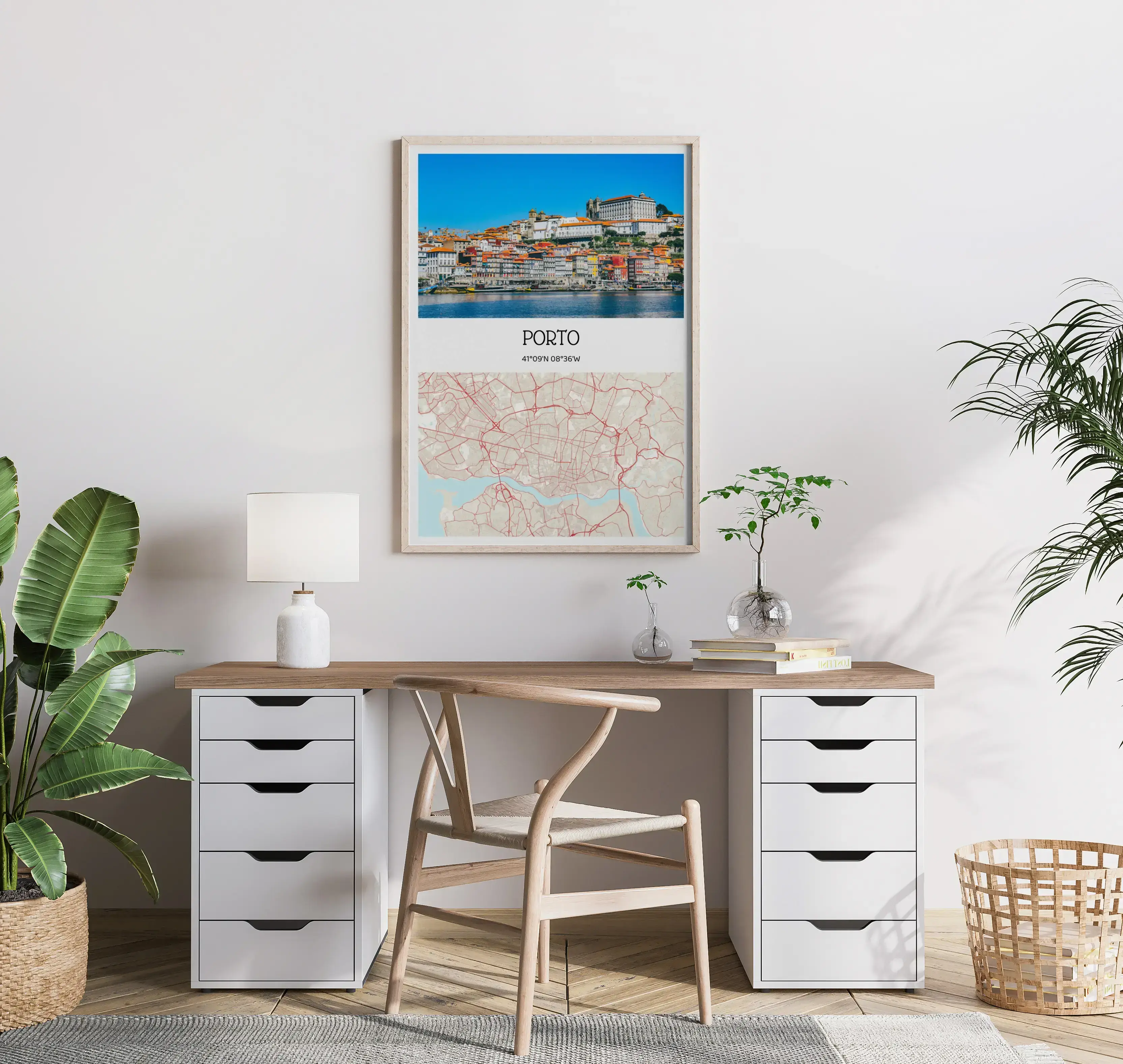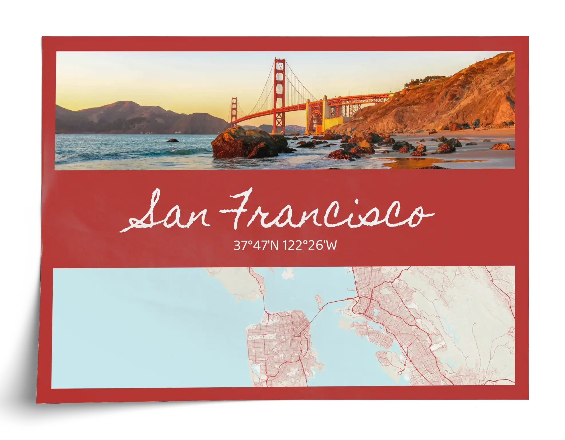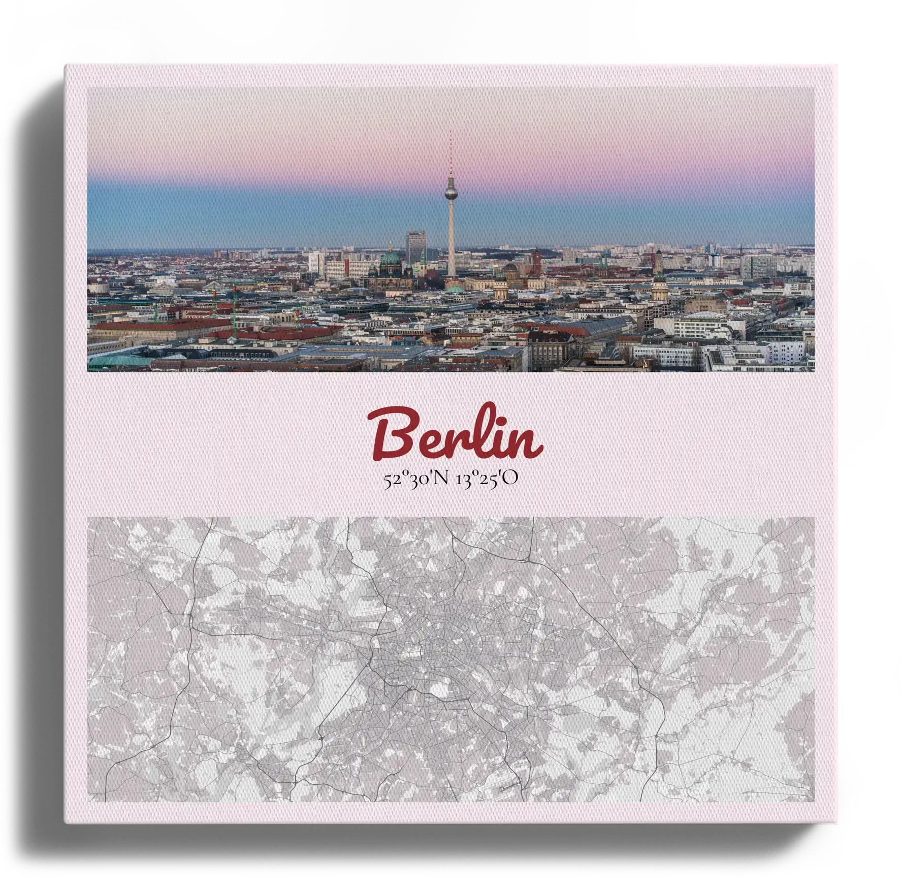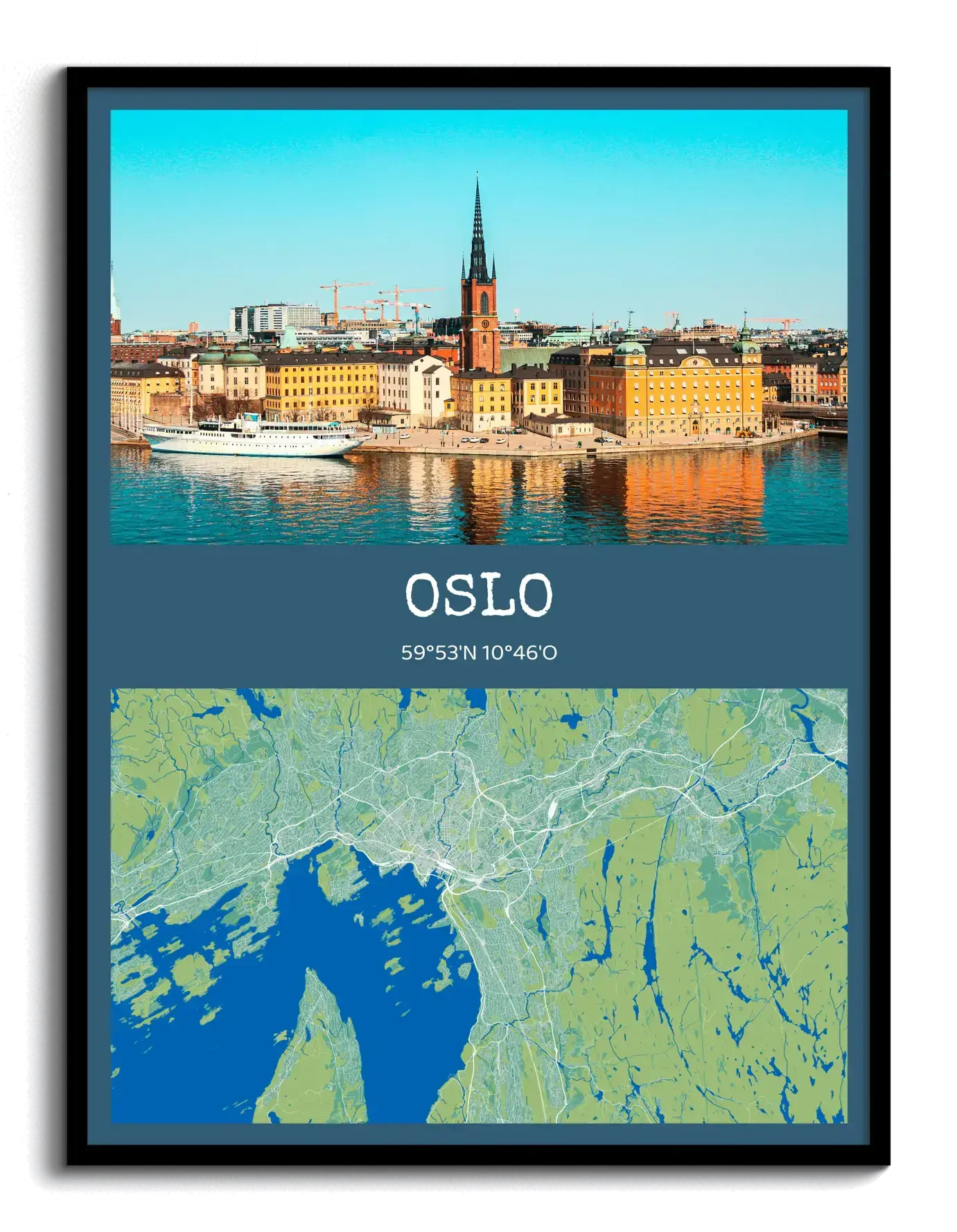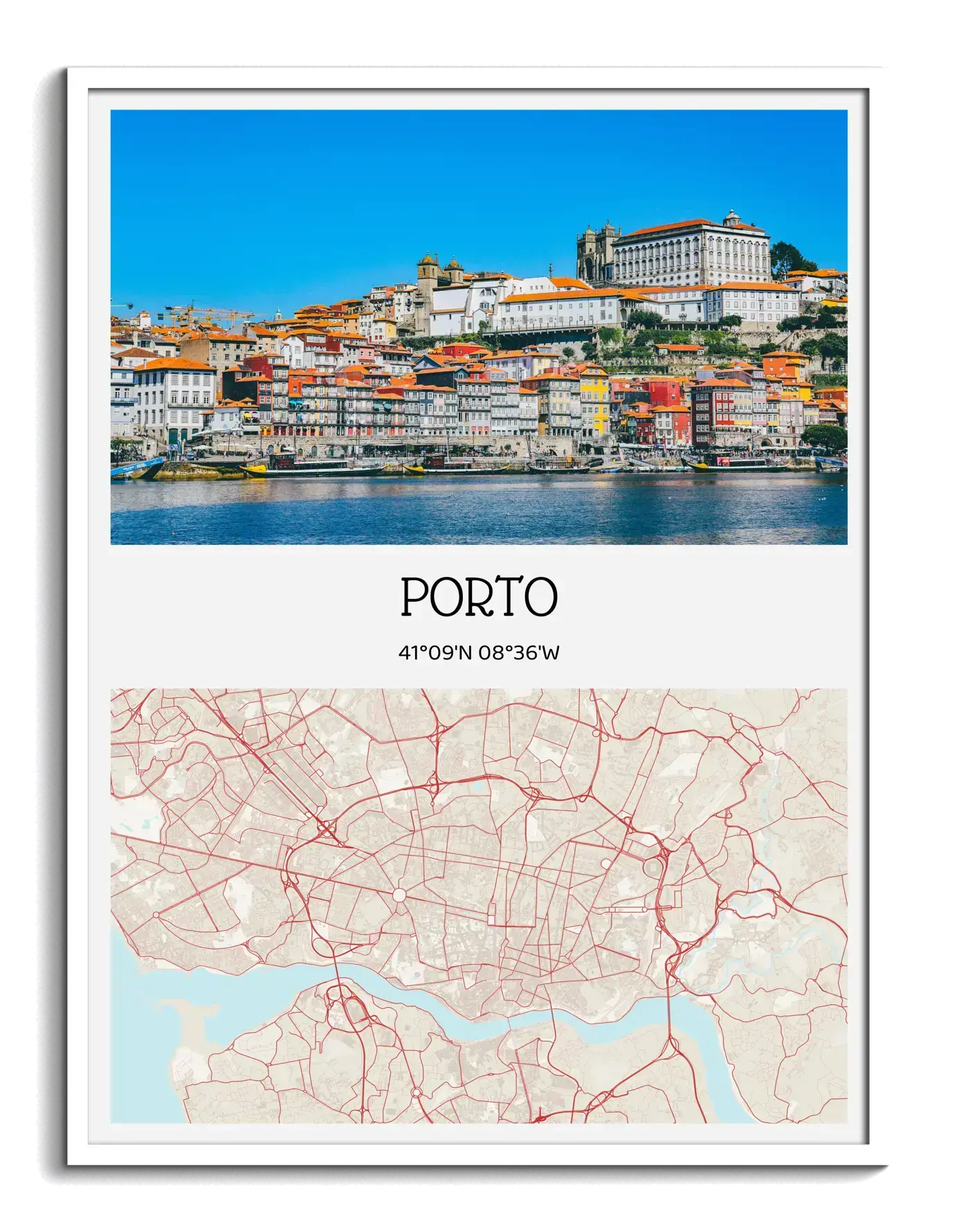 Gestalte jetzt deinen Kunstdruck und bestelle ihn direkt. Dieses Beispiel zeigt die Vorlage Fotokarte: oben ein Stadtfoto, darunter Stadtname und Koordinaten, kombiniert mit einer stilisierten Kartenansicht der Stadt. Motiv, Ort und Text lassen sich frei anpassen, damit aus deiner Erinnerung ein klares Designstück wird.