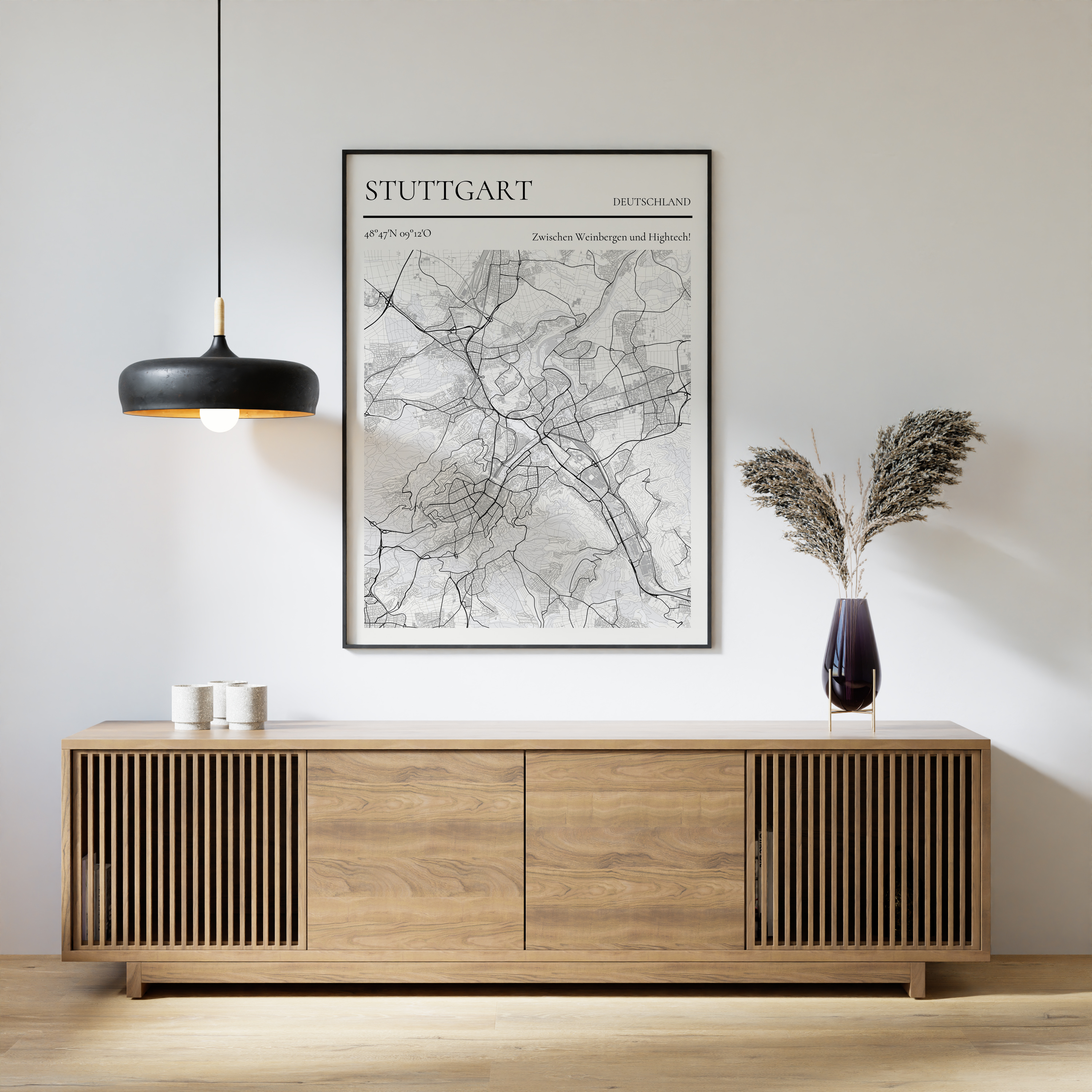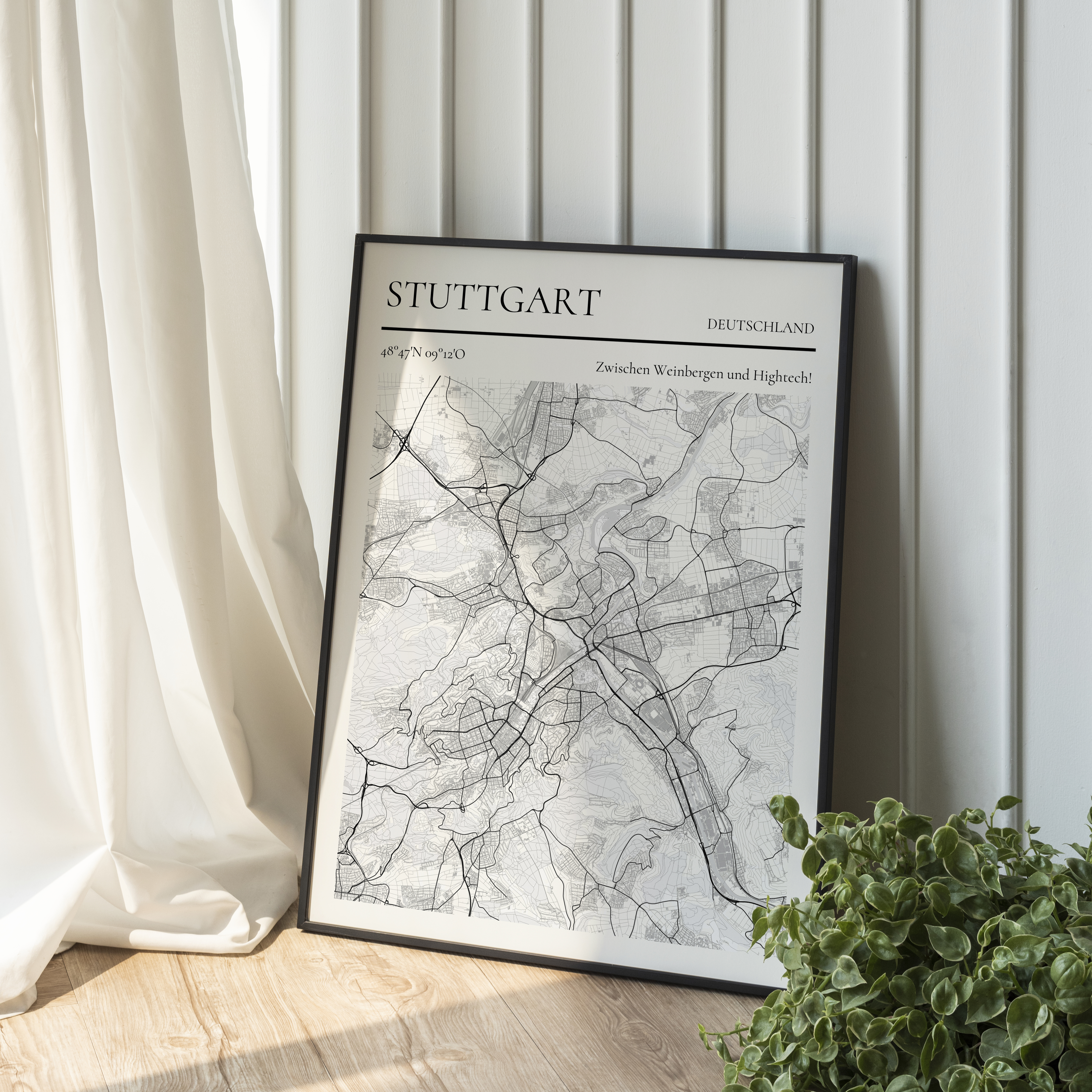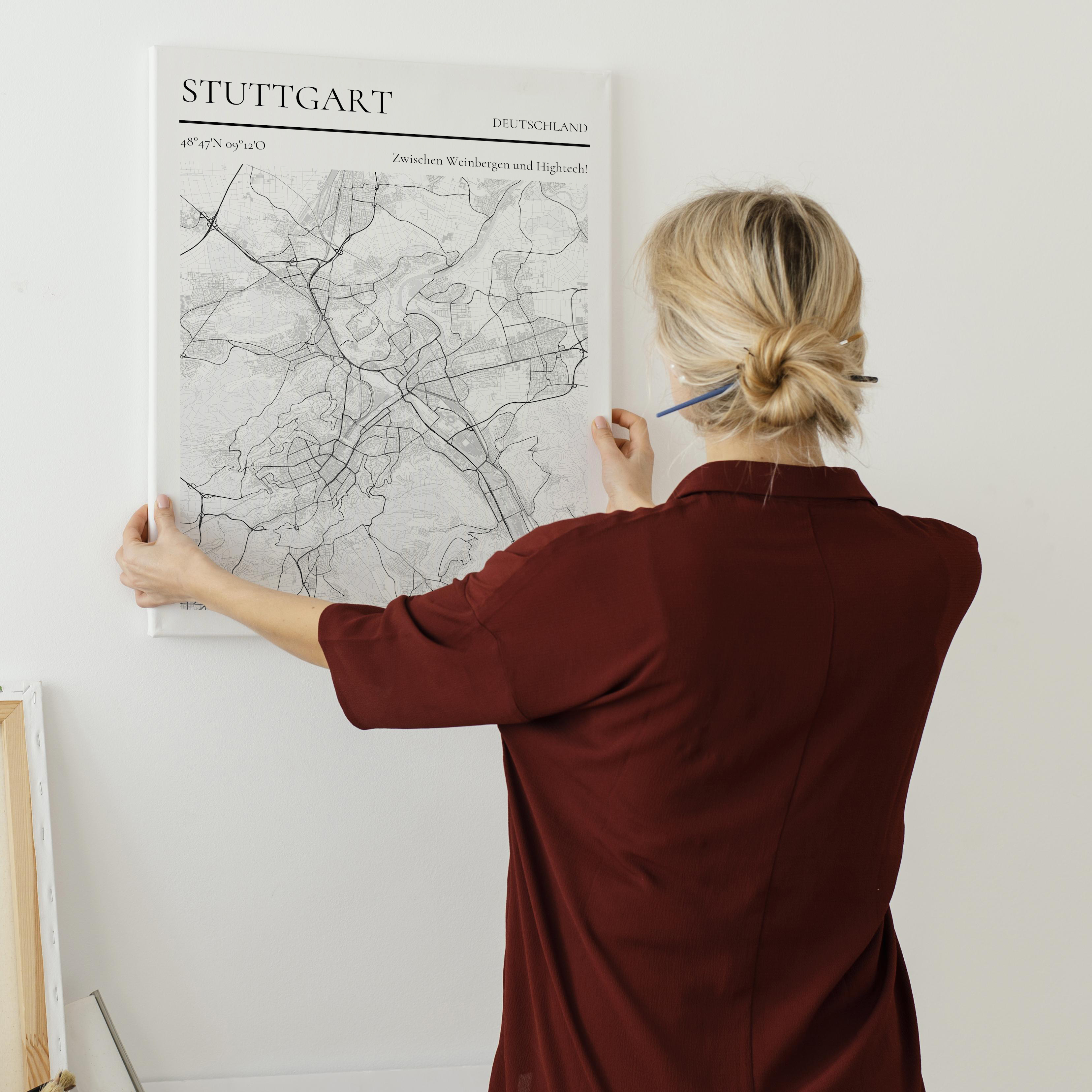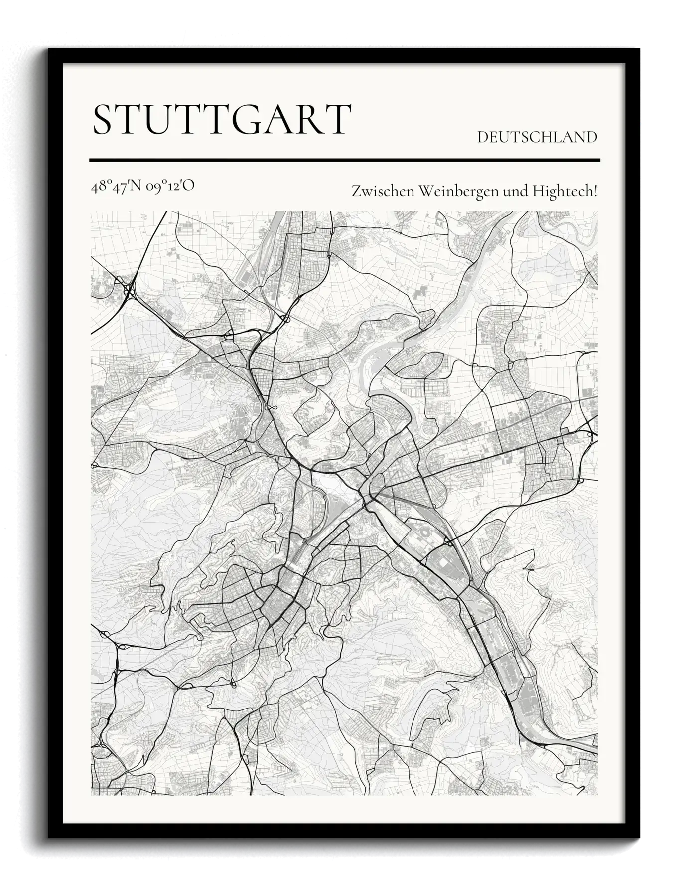 Personalisierte Stadtkarte von jedem Ort erstellen: Stuttgart im Magazinstil; Druck auf Poster, gerahmt, Leinwand, Acryl oder Alu-Dibond
