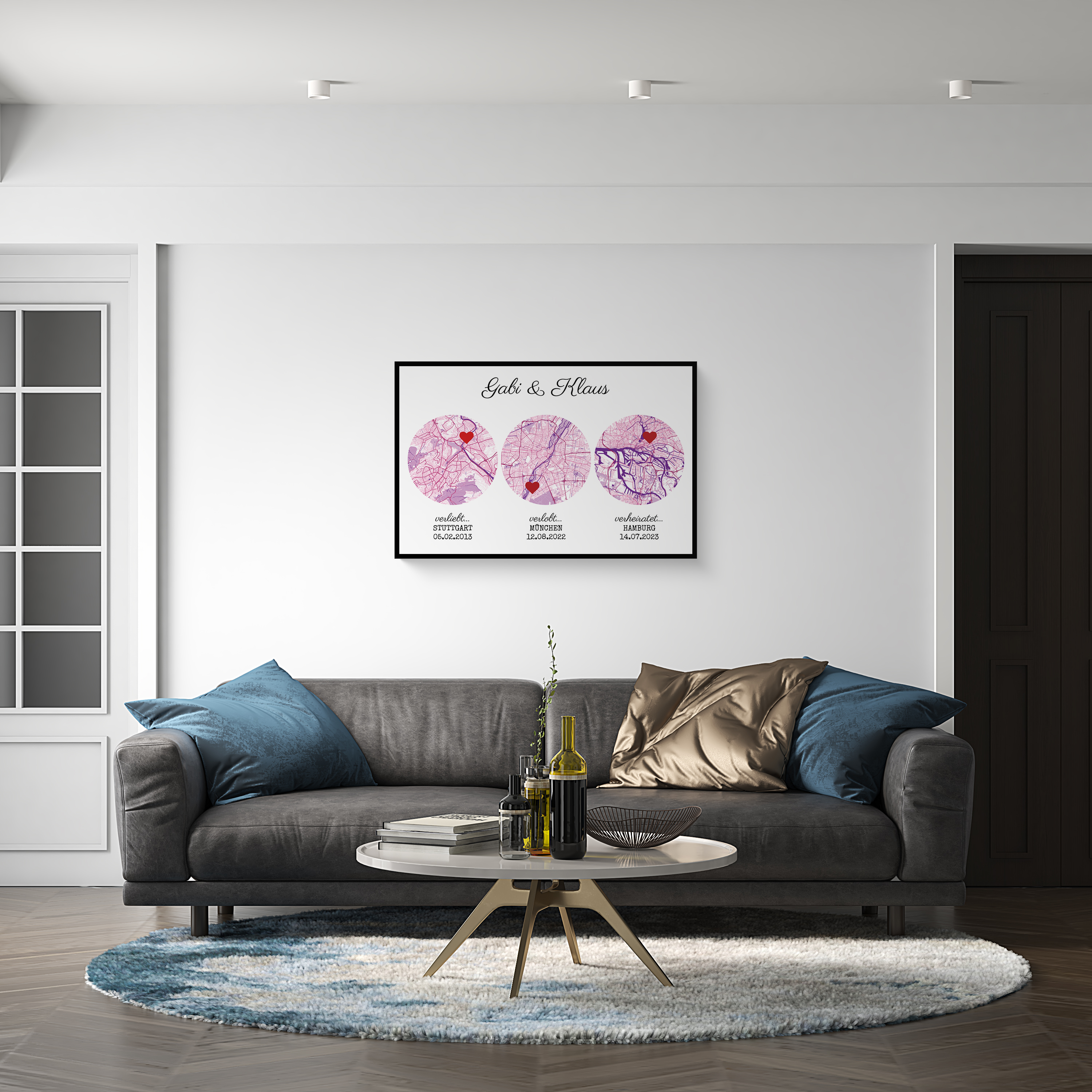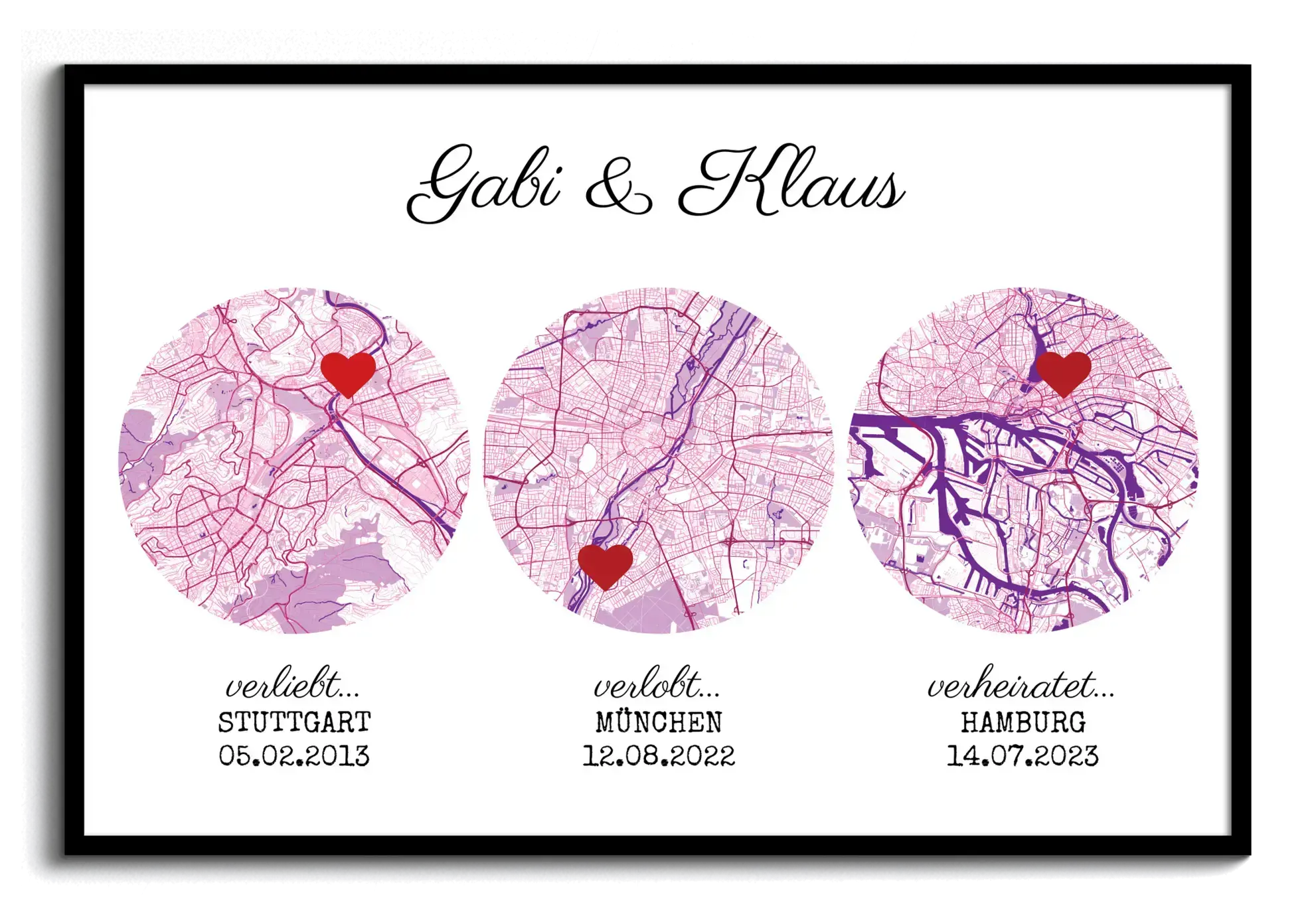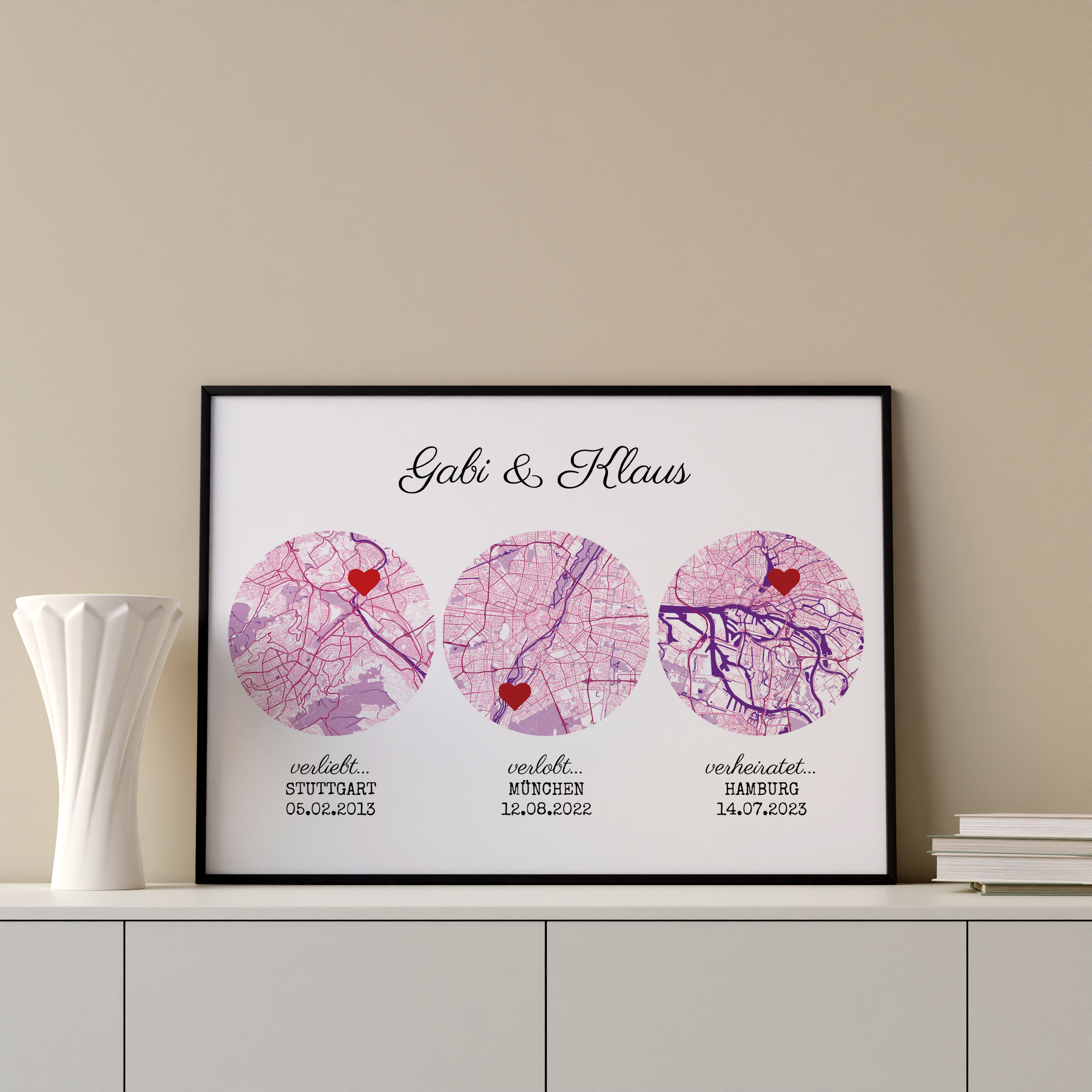 Verliebt, Verlobt, Verheiratet: Personalisiertes Hochzeitsgeschenk mit 3 Orten und Datum erstellen. Druck auf Leinwand, Poster, Alu-Dibond, Acryl